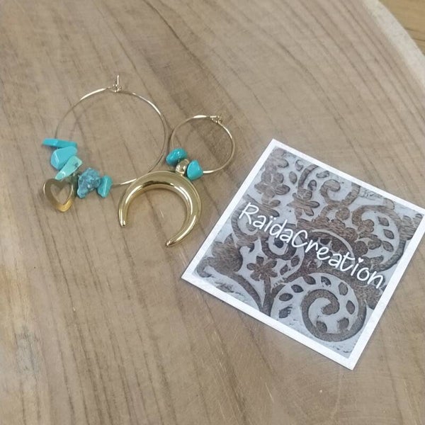 Turkoois - 'hoop' oorbellen gold-plated twee verschillende groottes en diverse bedels.